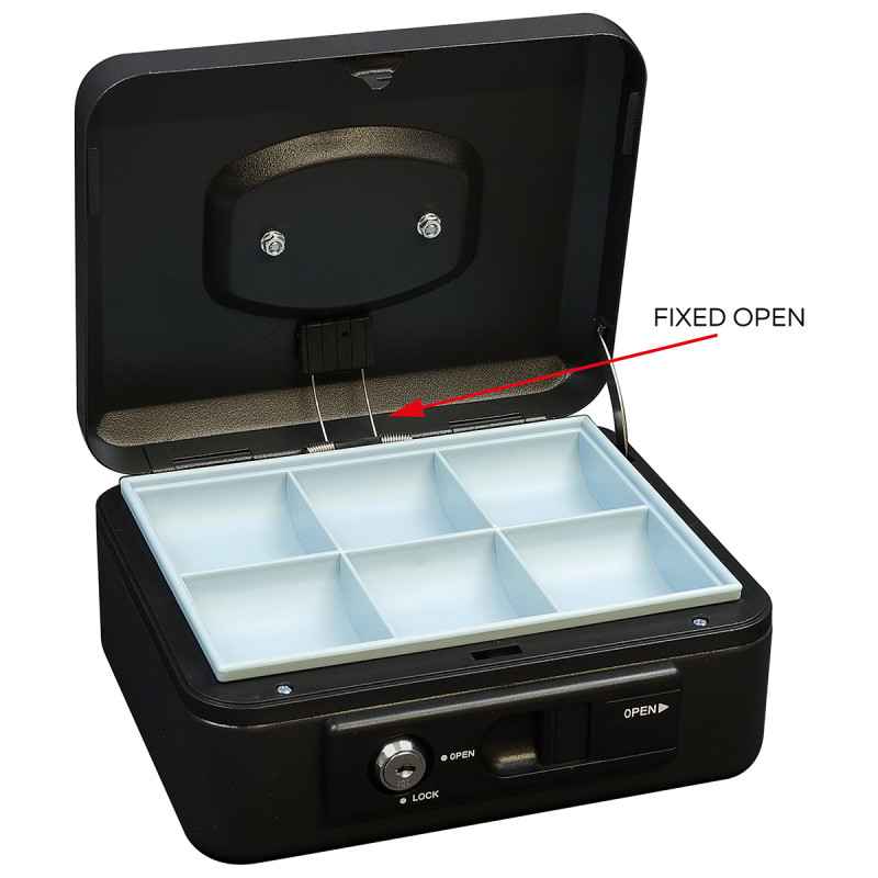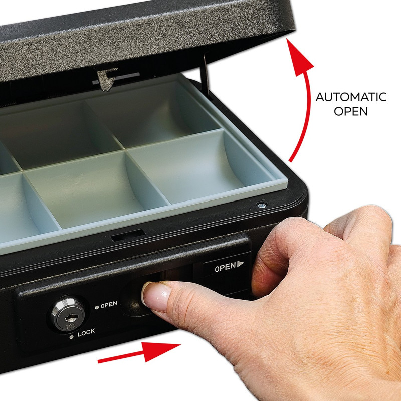 Pokladnička z ocele je vybavená vonkajšou páčkou pre pohodlné automatické otvorenie veka. Po uzavretí sa veko automaticky aretuje, čo umožňuje bezpečné prenášanie, bez nutnosti uzamknutia kľúčom.