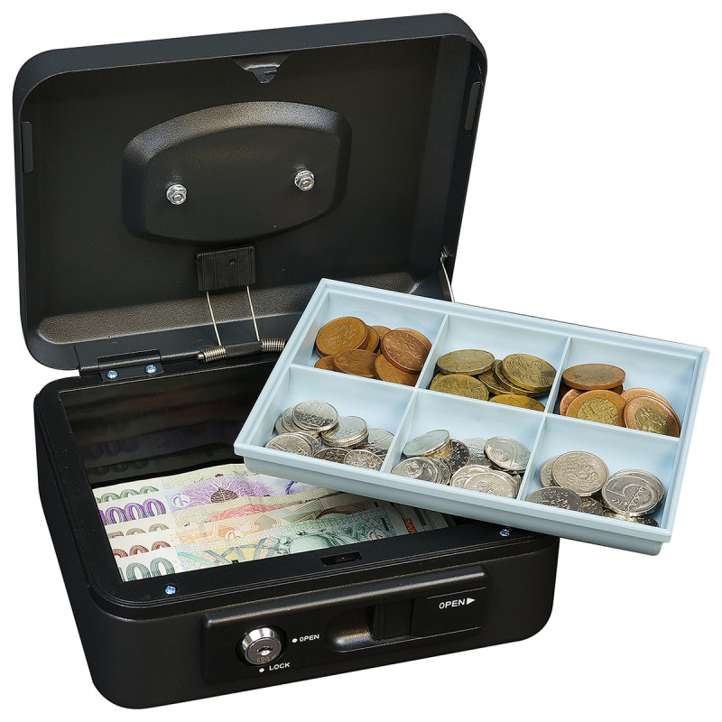 Oceľová pokladnička s páčkou pre pohodlné otvorenie veka a blokáciou proti jeho samovoľnému zatvoreniu