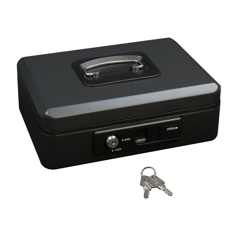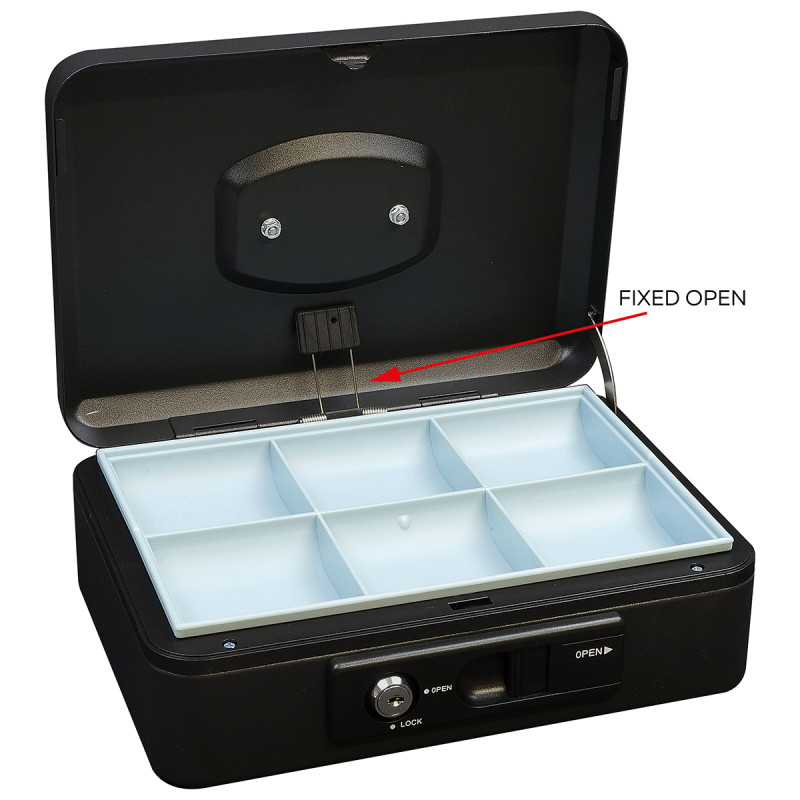 Pokladnička z ocele je vybavená vonkajšou páčkou pre pohodlné automatické otvorenie veka. Po uzavretí sa veko automaticky aretuje, čo umožňuje bezpečné prenášanie, bez nutnosti uzamknutia kľúčom.