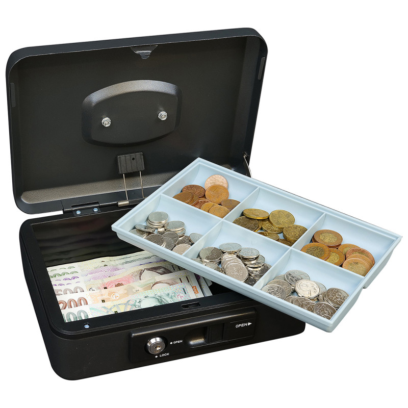 Oceľová pokladnička s páčkou pre pohodlné otvorenie veka a blokáciou proti jeho samovoľnému zatvoreniu
