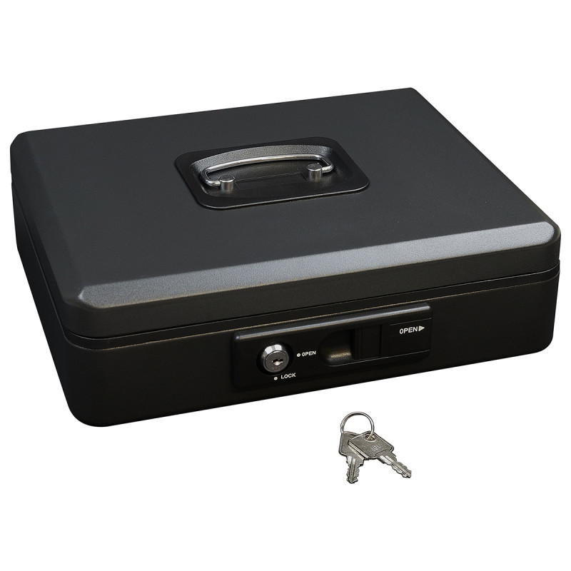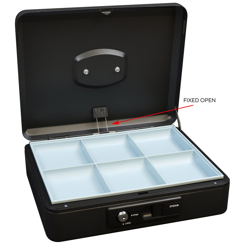 Pokladnička z ocele je vybavená vonkajšou páčkou pre pohodlné automatické otvorenie veka. Po uzavretí sa veko automaticky aretuje, čo umožňuje bezpečné prenášanie, bez nutnosti uzamknutia kľúčom.