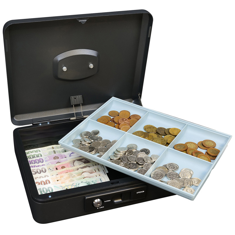 Oceľová pokladnička s páčkou pre pohodlné otvorenie veka a blokáciou proti jeho samovoľnému zatvoreniu
