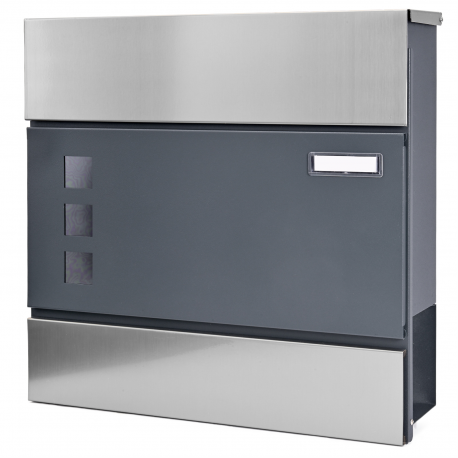 Jedinečný dizajn - kombinácia nerezu a antracitu, schránka s okienkom z číreho plexiskla, umožňujúca čiastočný priehľad do jej vnútra. Použitý materiál zaisťuje dlhodobé a trvanlivé používanie. Dolná časť slúži ako box na noviny. Klapka schránky schráni poštu a zámok pred dažďom. Štyri otvory pre rýchlu montáž. Súčasťou balenia je montážny materiál.
