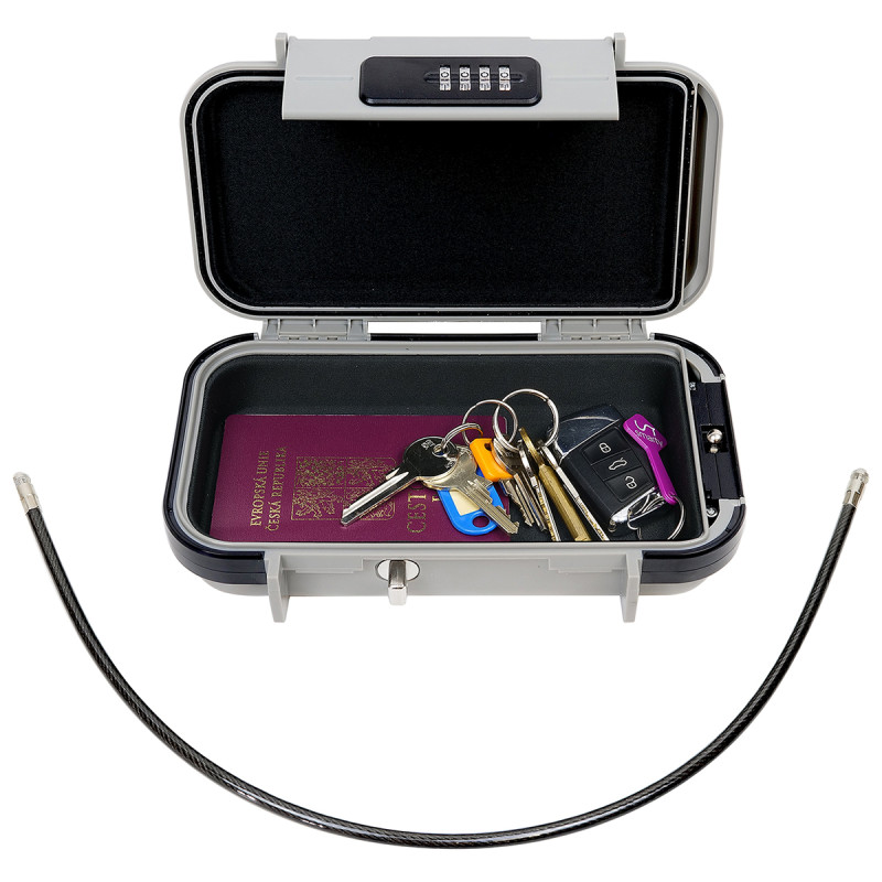 Mobilná vodotesná bezpečnostná schránka (depozit) z tvrdého plastu pre uloženie kľúčov, peňazí a osobných dokladov.
