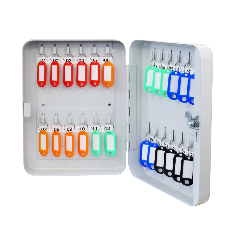 Oceľová schránka na kľúče, obsahuje farebné menovky a krúžky na kľúče. Jednoduché a prehľadne si organizujete množstvo kľúčov. Skrinku si uzamknete a ochránite tak obsah - kľúče. Ideálne namontovať na stenu, alebo dovnútra skrine. Menovky majú papierovú vložku, kde si napíšete text, ktorý určí napríklad názov dverí, skriniek, alebo zásuviek.